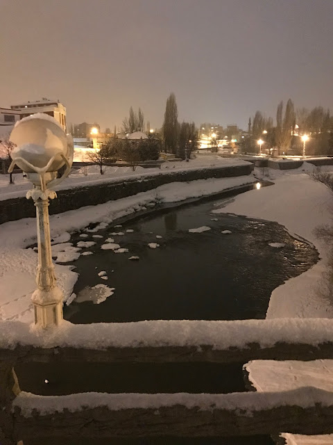 Artık otelimize dönüyoruz. Hava bu mevsimde erken kararıyor. Akşam yemeğinde başka bir tur organizasyonu ile bugün ama uçakla Kars' a gelmiş olan abim ve yengemle buluşuyoruz. Karşılıklı günümüzün nasıl geçtiği sohbetine eşlik eden kadehlerimiz ile keyifli bir yemek yiyoruz. Sonra Kars merkeze gidip bir kahve içelim fikri oluşunca odalarımıza çıkıp sıkı bir şekilde giyiniyor ve 10-15 dakikalık yürüme mesafesinde olan Kars merkezine yürüyoruz. Gece ışıklandırma altında bembeyaz karla kaplı dümdüz ve temiz Kars sokakları bana sanki bir Doğu Avrupa ülkesindeymişiz izlenimi veriyor. Güzel fotoğraflar alıyorum. Kahve Diyarı isimli şık bir kahvecide birer kahve içiyoruz. Arkada geniş de bir ısıtmalı bahçesi var. Garsonlar kızlı erkekli ve güler yüzlü. Sonra günün yorgunluğunu atmak üzere otelimize dönüyoruz.