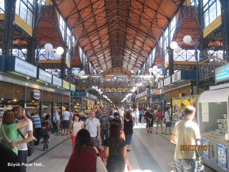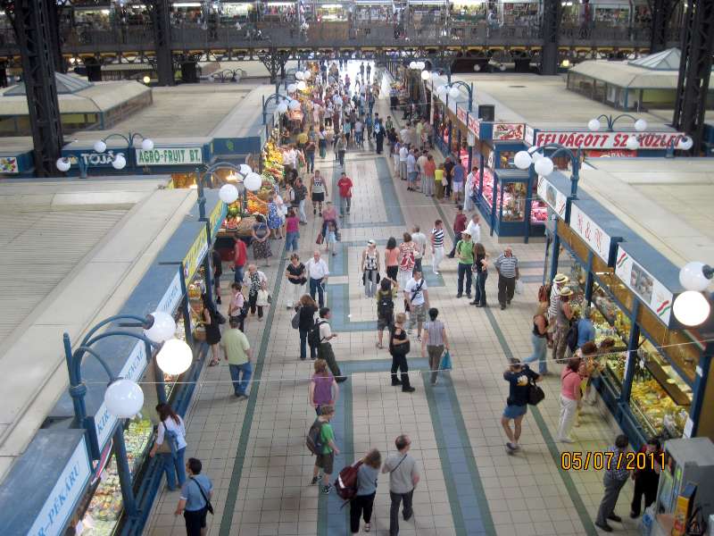 İki katlı kapalı pazarın ışıltılı ve renkli bir çatısı var. Giriş katı tamamen yiyecek malzemelerine ayrılmış. Meyve, sebze, et, macar salamları, biber çeşitleri, peynirler...Üst katlarda ise giyecek malzemeleri, hediyelik eşya dükkanları, restoran ve çeşit çeşit fast food tarzı kafeler. Oldukça hareketli ve renkli bir yer. Bir şeyler yemek için üst katta dolaştık ama kafamıza uygun bir yer bulamadık.