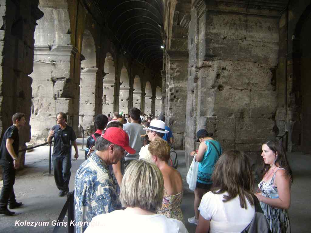 Nerede kalmıştık...Evet Kolezyum'a vardık. Vardık ama bizde Roma Pass yok. Dolayısıyla bilet almak için uzun bir kuyruğa girmek zorundayız. Allahtan sıra çok çabuk bize geliyor. Kişi başı 12 €'ya hem Kolezyum'a hem de Forum'a giriş biletini alıyoruz. Bu arada Kolezyum'a sıra beklemeden girmek istiyorsanız Roma Pass almak dışında bir yol daha var. Eğer birkaç Euro daha verirseniz rehberli tur biletlerinden alabilirsiniz ve sıra beklemek zorunda kalmazsınız ama bir rehberin geleceğinden şüpheliyim sadece sıra beklememiş olursunuz yani.