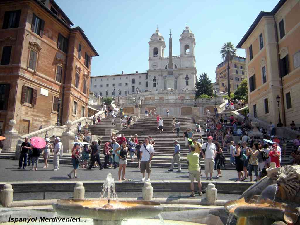 Meydanın devamında, meydanla kiliseyi birleştirmek üzere yapılmış ünlü İspanyol Merdivenleri'ne doğru ilerliyoruz. Hediyelik eşya satıcıları bu merdivenleri doldurmuşlar. Merdivenlerde biraz dinlendikten sonra İspanyol Merdivenleri'nin karşı caddesi olan Via Condotti'de yer alan şık dükkânlara sadece göz gezdiriyoruz.