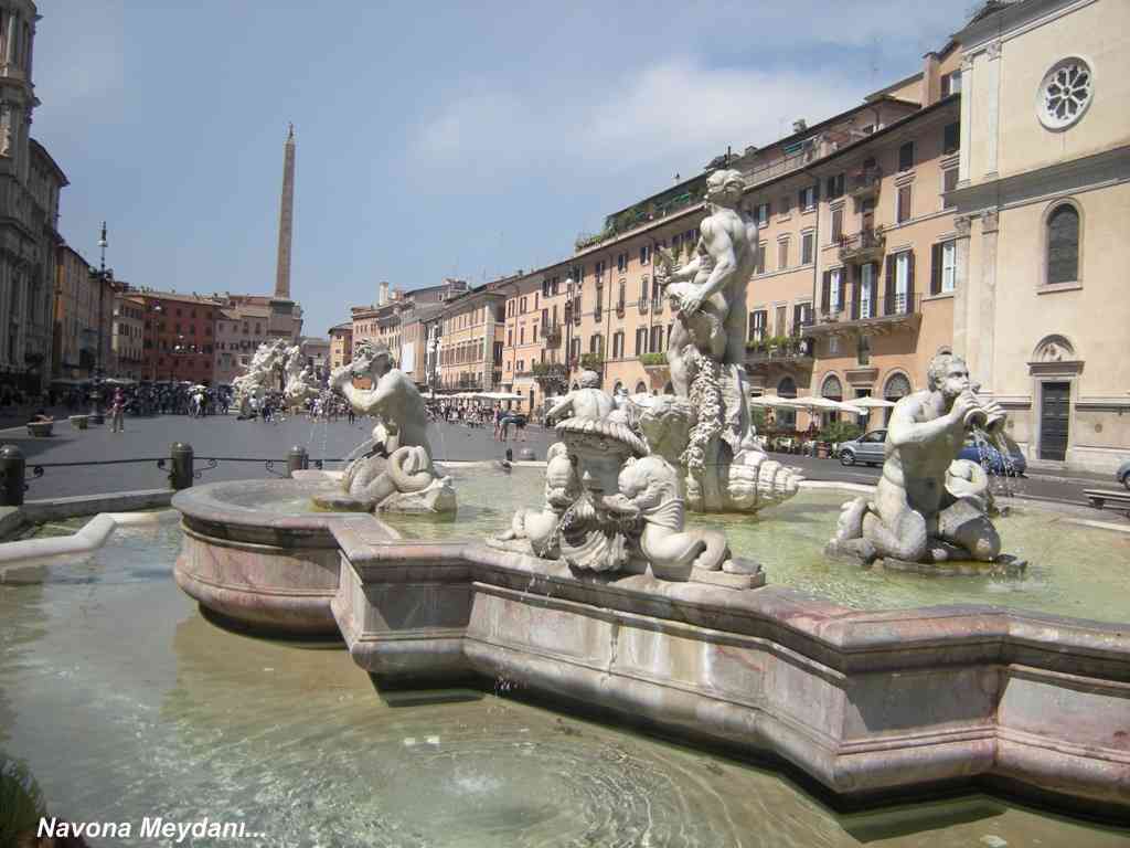 Artık Roma'nın en eğlenceli meydanı olan Navona Meydanı'na gitme vakti geliyor. Burası oval ve büyük bir meydan. Ama büyüklüğü meydanı kavramanıza engel olup onu sevimsizleştirecek boyutta da değil. Roma'nın en hareketli meydanlarından biri. Bu meydanda Dört Nehir Çeşmesi ve Sant'Angese in Agone Kilisesi'ni görmeniz mümkün. Dört Nehir Çeşmesi, dünyanın dört bir yanındaki dört büyük nehri temsil ediyor. (Tuna, Ganj, Nil ve Rio della Plata) Meydanın iki ucunda başka çeşmeler de var, ayrıca lüks ve şık kafe ve restoranlar da görebilirsiniz.