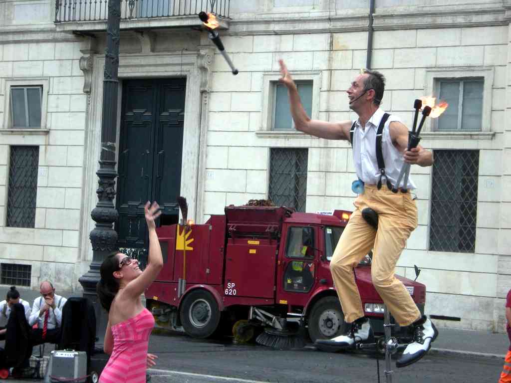 Diğer taraftan Navona meydanında Avrupa şehirlerinin vazgeçilmezleri sokak sanatçıları bol miktarda mevcut. Saatlerce hareketsiz bir şekilde duran değişik görünümlere bürünmüş insanlar, 10 dakika gibi bir sürede portrenizi çizebilen ressamlar, müzisyenler kısacası ne ararsanız var. Biz de gösteriler eşliğinde akşamı burada karşılamaya karar verip, önümüzdeki zaman aralığında kentin Tiber Nehri'nin diğer yakasında kalan kısımlarına göz atmaya karar veriyoruz. Buralarda dar ve sevimli sokaklar karşılıyor bizi dönüş yolunda ise Via del Portico d'Ottavia civarında 'kosher' yazıları dikkatimizi çekiyor ve bir Yahudi yerleşim bölgesinde olduğumuzu anlıyoruz. Yakınlarda bir de sinagog ve bitişiğinde de küçük bir müze var. Yürüdüğümüz yollar bizi inanılmaz güzel bir avluya çıkarıyor ve biz bir defa daha insanın kendini sürprizlerle dolu bu kente açması gerektiğini anlıyoruz. Zaten seyahat etmek kendinize gittiğiniz yerden ufakta olsa bir şeyler katmanızı sağlayacak araçlardan biri bence. Ne de olsa gerçek yolculuk geri dönüşle başlıyor...