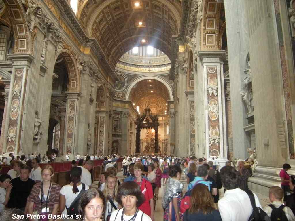 Şapeli gezdikten sonra müzeden çıkıp avlunun ortasındaki çeşmeden su içip dinleniyoruz sonra müzenin gezilecek yerlerinin bitmediğini anlayıp alt kata geçiyoruz. Burada papaların mezarları bulunmakta. Sonra San Pietro Bazilikası'nı gezmeye başlıyoruz. Büyük ve gösterişli bazilikada Michelangelo'nun ünlü Pieta'sı yer almakta. Ancak heykele önceki yıllarda çekiçle yapılmış bir saldırı nedeniyle, heykeli camekân arkasından görebiliyoruz sadece. Bu arada içeride ayrılmış bölümde devam eden bir ayin var. Dışarıda ise Papa'nın her çarşamba verdiği vaaz için meydan hazırlanıyor. Ancak halka verilen bu vaaza Vatikan'dan alınan bilet mukabilinde katılmak mümkün. İtalya'da ilginç bir şekilde dini yapıların pek çoğuna giriş ücretli. Daha da ilginç olanı ise, kiliselerde normal mum yerine artık elektronik mum sistemine geçmiş olmaları. Hani kiliselerde mumun bulunduğu bir bölüm olur eğer, mumdan yakmak isterseniz altında yer alan sandığa 1-2 € gibi bir parayı atmanız gerekir. İşte İtalyanlar (mumu yakıp parayı atmayanlar için bir önlem olarak mı acaba?) normal mum yerine elektronik mumları tercih etmişler. Parayı atıyorsunuz, akabinde bu mumlardan biri yanıyor. İlk defa karşılaştığım bir uygulama. Diğer taraftan, müzelerden alınan ücretler de açıkçası kayda değer. Ancak bu yapıların iyi korunmasından hareketle elde edilen gelir yine buraların bakımına harcanıyor diyebiliriz.