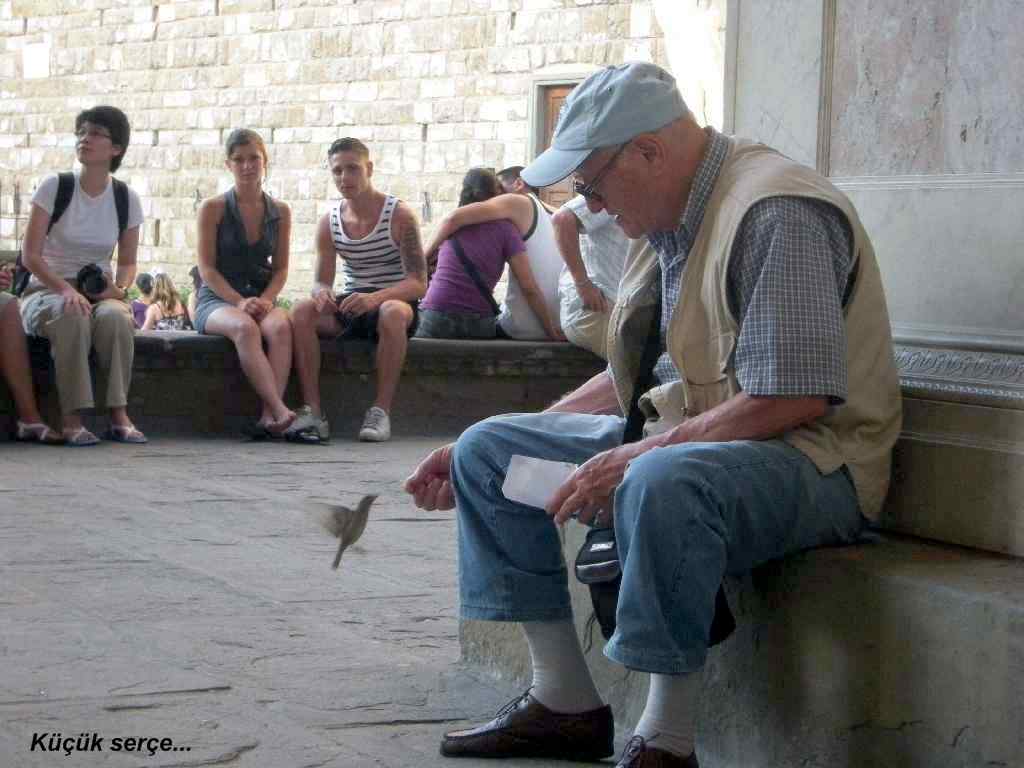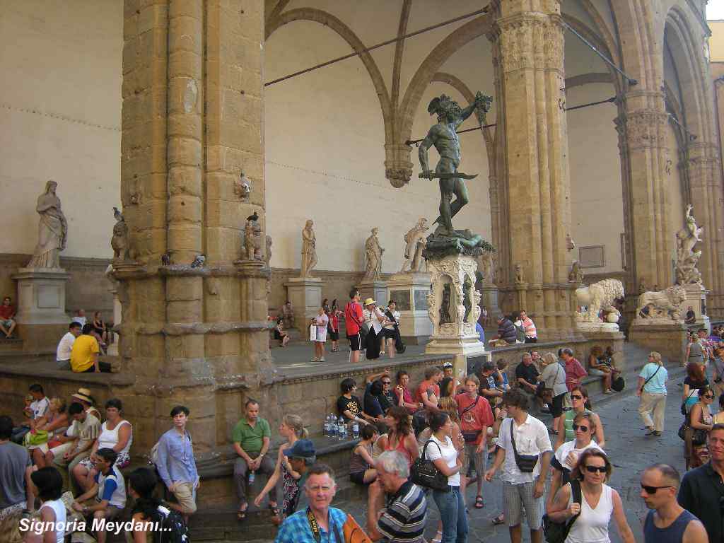 Buradan sonra kısa bir yürüyüş bizi Piazza della Signoria Meydanına ulaştırıyor. Burası kentin sosyal ve kültürel merkezi. Belediye Sarayı'nın da bulunduğu bu meydan insan seli, adeta ruhu olan heykeller ve sokak sanatçıları ile her daim cıvıl cıvıl. Her yer heykellerle süslenmiş. Bunlardan bence en güzeli Benvenuto Cellini tarafından yapılan ''Perseus'un Medusa'nın başını kopardıktan sonra havaya kaldırması'' sahnesinin betimlendiği heykel. Michelangelo'nun ünlü Davut heykelinin 1973'te yerleştirilen kopyası da burada. (Gerçeği ise Galeria dell'Accademia'da bulunuyor) Biz de meydanda biraz oturup soluklanmak istiyoruz. Derken görevli olduğunu düşündüğümüz bir adamın elindeki ekmek kırıntısını kapmak üzere havalanan serçe dikkatimizi çekiyor. Serçeyi ve onu besleyen adamı izleyerek epey bir vakit geçiriyoruz. Bundan sonra burada geçireceğimiz 5 gün boyunca bu kuşla tekrar tekrar karşılaşacağız.