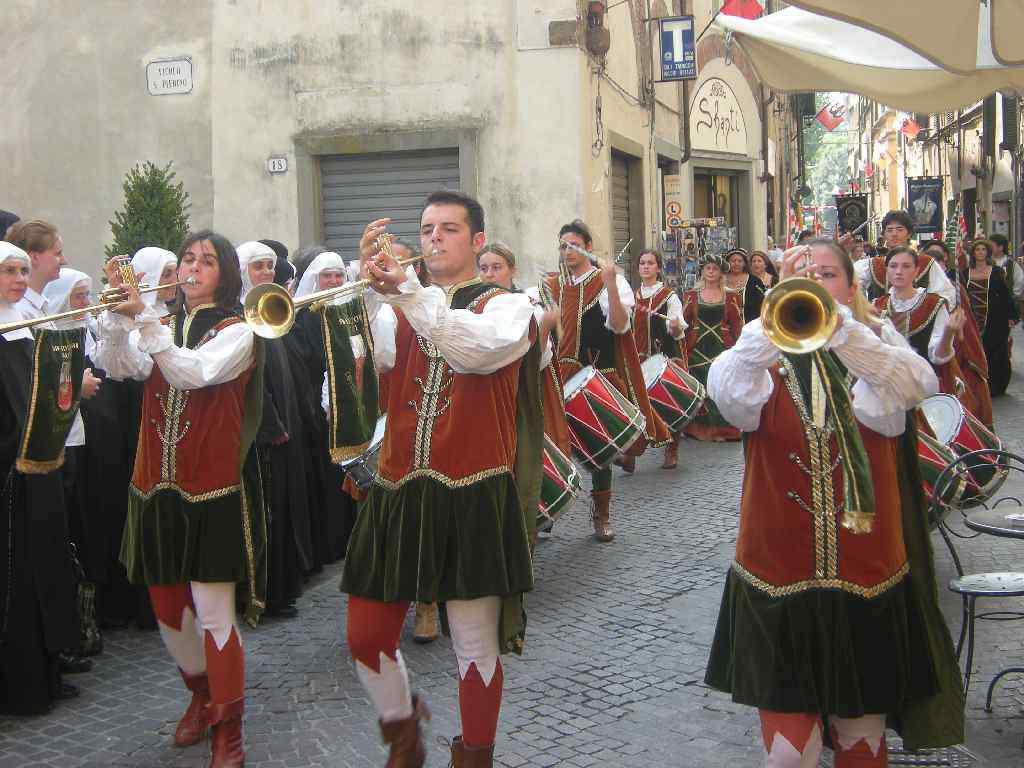 Pizzalarımızı yedikten sonra, dün Lucca'da rastladığımız gibi, geleneksel kıyafetleriyle sokaklarda gösteri yapan gruplarla burada da karşılaşıyoruz. Trompet çalan, ellerindeki değişik nesneleri havaya atıp yakalayarak çeşitli maharetler sergileyen, topluluğu biraz izleyip şehrin kalbi olan Piazza del Campo'yu buluyoruz. Burada yılda 2 defa 'Palio' denilen at yarışları yapılıyormuş. Allahtan bu yarışlara denk gelmiyoruz. Bir dakikadan az süren ve eyersiz at üzerinde yapılan bu yarışlar meydanda izdihama yol açıyormuş çünkü. 1590 yılında boğa güreşlerinin yasaklanmasıyla başlayan yarışlarda, her bir at ve binicisi, şehrin 'Contrada' adı verilen 17 semtinden birisini temsil ediyor ve her binici, temsil ettiği semtin renklerine, simgelerine uygun olarak giyiniyormuş. Her Contrada'nın toplanma zamanları varmış. Geleneksel kıyafetlerini giyen kişiler sokaklarda trompet çalıp gösteri yapıyorlarmış. Palio zamanı yaklaştıkça bu gösteriler artıyor ve her Contrada en güzel gösteriyi yapmaya çalıyormuş. Şimdi Palio hakkında bir fikir sahibi olduktan sonra, hem Lucca hem de Siena'da rastladığımız etkinliklerin Contrada'ların düzenledikleri gösterilerle ilgili olması gerektiğini düşünüyoruz.
