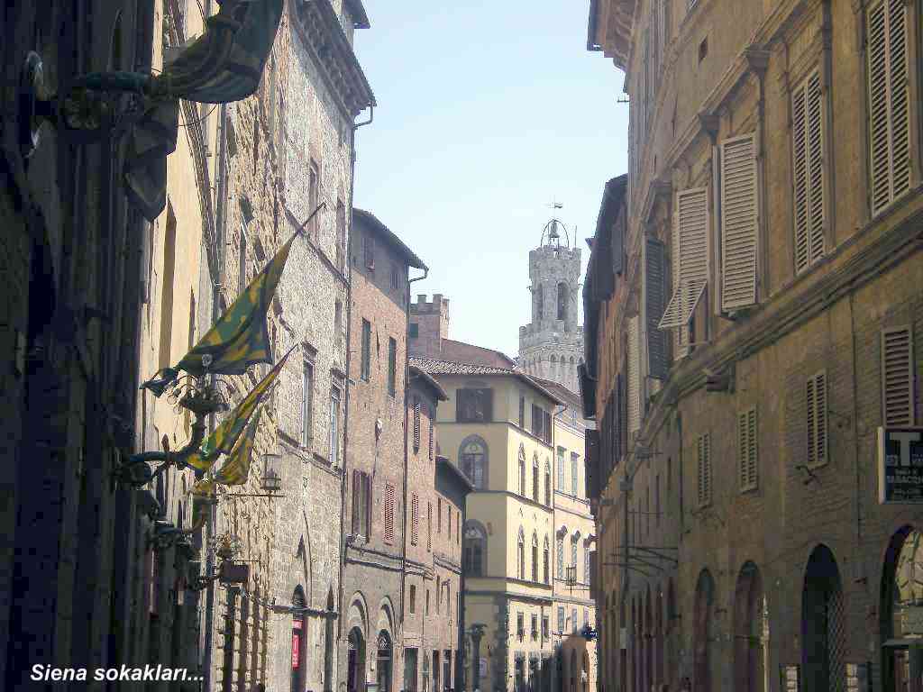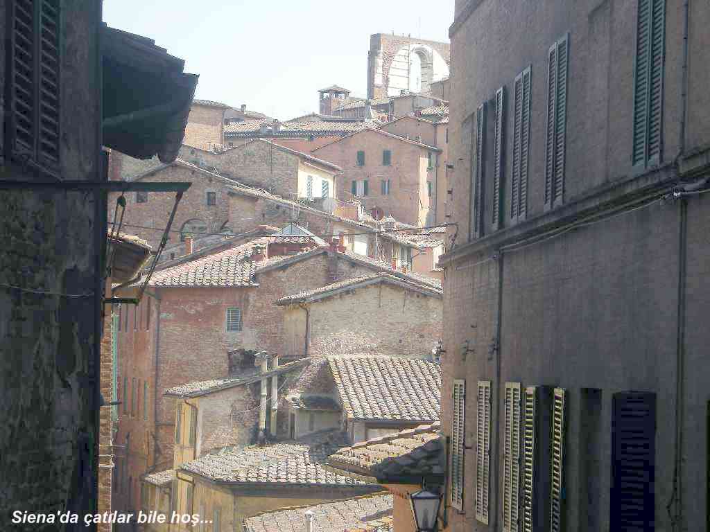 Siena'nın tren istasyonunda inince şehir merkezine nasıl gideceğiz diye düşünüyoruz. Siz düşünmeyin efendim. Büfedeki İngilizce sorunuza İtalyanca cevap veren kadından 1 €'ya otobüs bileti alın, tren istasyonunun karşısındaki alışveriş merkezine girin sonra otobüsleri gösteren okları takip ederek dışarı çıkıp asansörle aşağıya inin. İşte otobüs durakları burada. Tren istasyonu ile kent merkezi arasındaki mesafe kısa gibi görünüyor ama dönüş yolunda yürümeye kalkınca anlıyoruz ki o kadar da kısa değilmiş. Otobüsten şehir merkezinde inince sağa doğru 100 metre gittikten sonra sol tarafta ismini hatırlamadığım küçücük bir pizzacı var. Burada İtalya'da yediğim en güzel pizzayı yiyoruz. Sahibi pizzayı gözünüzün önündeki fırında o anda yapıp satışa sunuyor. Siz de fırsat bulursanız içeride oturulacak yeri dahi olmayan bu pizzacıdan fırından yeni çıkmış sebzeli pizzanızı alın ve Siena'nın kahverengi-kızıl sokaklarıyla yemek keyfinizi paylaşın.