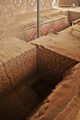 Piramitlerden bir detay. Kumdan kaleler gibi görünen kum katmanı, El Niño tarafından yıkandıktan sonra bu hale gelmiş. Katlar seçilebiliyor. En alttaki kat Sicanlar, sonrakiler ise Chimular tarafından yapılmış. Kazı alanını daha yakından incelemek yasak!