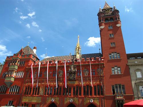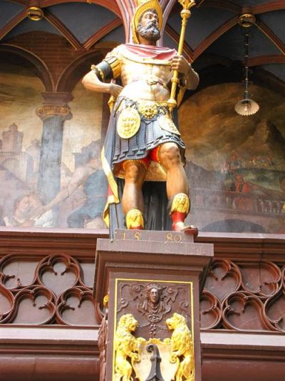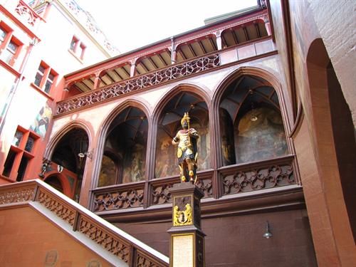 Güzel belediye binası genel olarak 16.yy ın çizgilerini taşıyor ama tabii, Avrupa da birçok yerde olduğu gibi 19 yy. a kadar eklemeler de yapılmış. Ünlü Rönesans sanatçısı genç Holbein'ın da Toplantı salonunun dekore edilmesinde görevli olduğu biliniyor.Biraz avluya doğru girelim, bakalım diyorum.