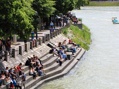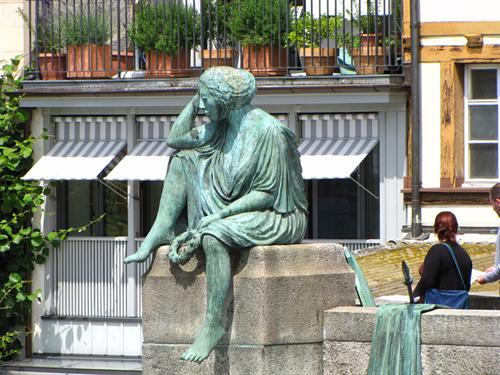 İşte karşı kıyıya geçtik bile... Köprünün başını güzel bir heykel sınırlıyor, yapılı bir kadın heykeli bu, Ren i seyrediyor. Ren i seyreden yalnız o değil, bu güzel güneşli günde öğle tatilini fırsat bilen gençler de kendilerini sahile atmışlar, güneşten faydalanıyorlar.