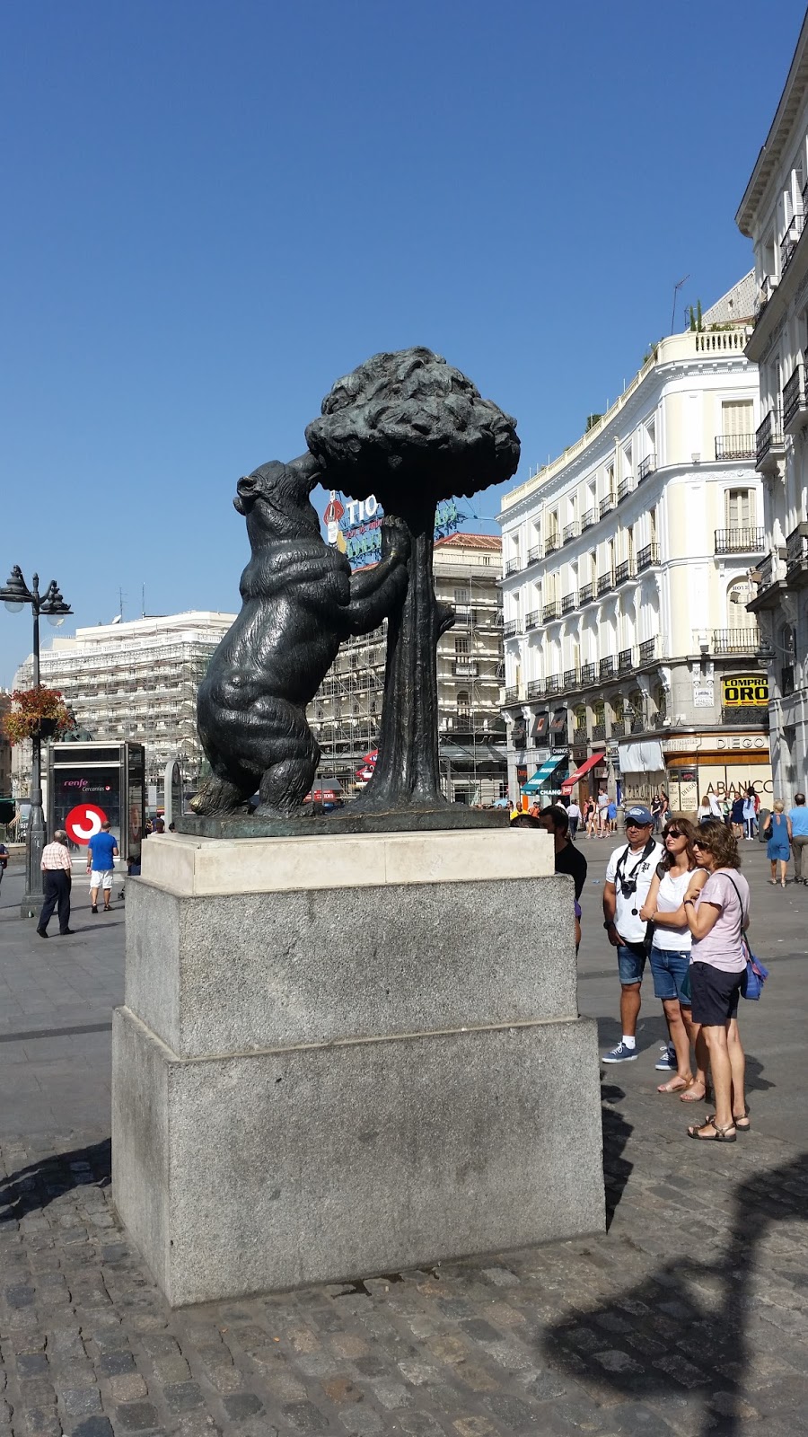 Puerto del Sol meydanı Madrid'in en meşhur meydanlarından bir tanesi. Yarım daire şeklindeki bu meydanın içerisinde iki tane de süs havuzu bulunmakta ama nedense biz oradayken ne yazık ki içlerinde su yoktu. Oysa ki bu sıcak Madrid gününde fıskiyeleri çalışsa hiç de fena olmazdı. İspanyolcada Güneş kapısı anlamına gelen bu meydan Madrid için bir başlangıç noktası olarak kabul ediliyor. Etrafında bir çok turistik restoran, kafe ve benzeri yerler bulunan bu meydanda aynı zamanda Madrid'in simgesi haline gelmiş meşhur çilek yiyen Ayı heykelini de görebilirsiniz. Genelde büyük grevler, gösteriler bu meydanda yapılıyor. Biz oradayken de boğa güreşlerinin yasaklanması için çok kalabalık bir grup gösteri yapıyordu.