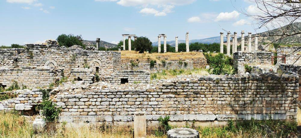 Ertesi gün rotamız son yıllarda meşhur olan, turistlerin akın ettiği lavanta kokulu köy Kuyucak. "Gelecek Turizmde" adlı kalkınma programı sayesinde bugünlere gelmiş. Lavantalar Haziranın ikinci haftası çiçeklenmeye başladığı için sadece lavantaların ritmik bir şekilde tarlalarda dizilmiş yeşil bir top gibi açmış hallerini görüyoruz. Aralarda estetik hoş mekânlar yaratılmış, kadınlar traktör üzerinde kendinden emin neşeyle işlerinin başındalar. Sevimli dükkânlar ve tezgâhlarda lavantayla yapılmış her şey var. Lavantalı sabun, kokusu, kolonyası, çayı, yağı, lokumu, balı, gazozu, dondurması ve muhallebisi var. Lavanta Kokulu Kafe de görüntüsüyle çok davetkâr. Kuyucak Köyü'ne ekilen lavantalar şu an 3000 hektara ulaşmış. Lavantalar açmadığı için köyde turist pek yoktu. Bu sakinlik, köylülerin tatlı telaşı, güneşin ışınlarının pırıl pırıl lavanta tarlalarına yansıması, mis kokular, köyün sempatik insanlarıyla sohbet bize yetti.  Dört tarafı da dörder sütundan oluştuğu için bu adı alan Tetrapylon, tören alaylarının toplanarak, Afrodit tapınağına ulaştığı kapı olarak biliniyor. Sağda ise Frigidarium'daki (soğuk oda) havuz...